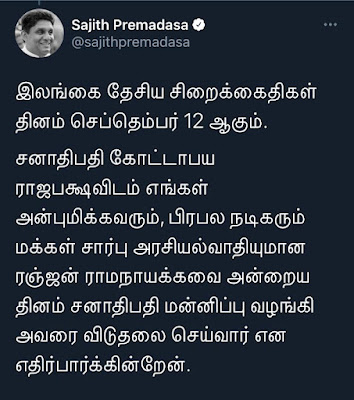 ஜனாதிபதி கோட்டாபய ராஜபக்க்ஷவிடம் எங்கள் அன்புமிக்கவரும், பிரபல நடிகரும் மக்கள் சார்பு அரசியல்வாதியுமான ரஞ்சன் ராமநாயக்கவை அன்றைய தினம் ஜனாதிபதி மன்னிப்பு வழங்கி அவரை விடுதலை செய்வார் என எதிர்பார்க்கின்றேன் என அவர் அந்த செய்தியில் பதிவிட்டுள்ளார்.